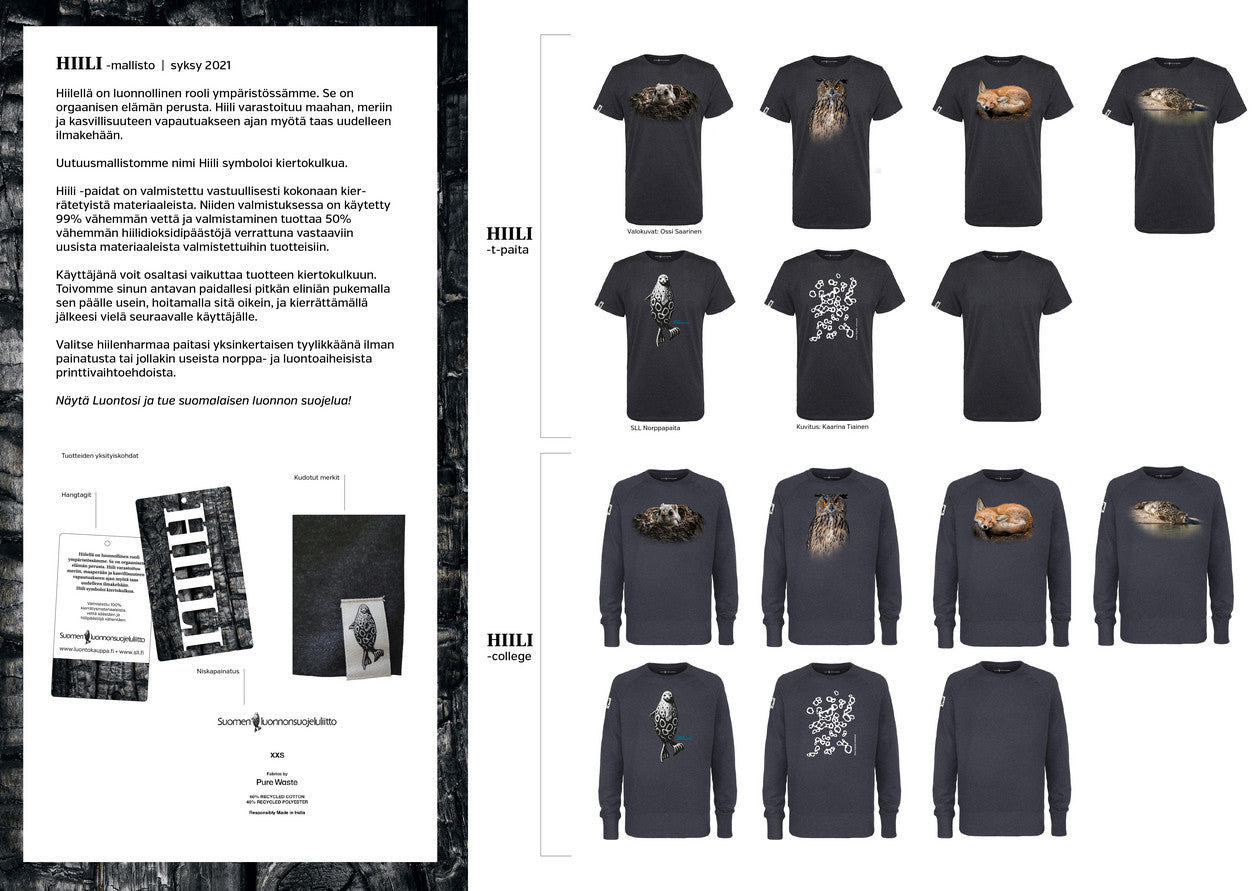 Jo alkuvaiheessa oli tarkoituksena suunnitella sekä college että t-paita, jotta koko mallisto saataisiin yhdenmukaiseksi. Paitojen väriksi valittiin klassisen tyylikäs ja ajaton antrasiitin harmaa. Kankaan meleeraus toi pintaan elävyyttä. Tumma harmaan sävy myös osaltaan inspiroi malliston HIILI -nimeä. Yksityiskohtina tuotteisiin suunniteltiin Suomen luonnonsuojeluliiton omat niskapainatukset sekä kangasmerkit, jotka kiinnitettiin collegen olkapäähän ja t-paidan hihanreunaan.