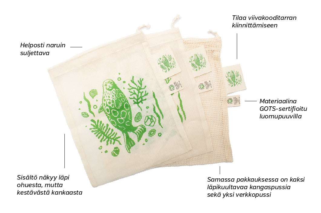 Kuva 2. Kestohedelmäpussit on suunniteltu käytännöllisiksi ja pitkäikäisiksi.