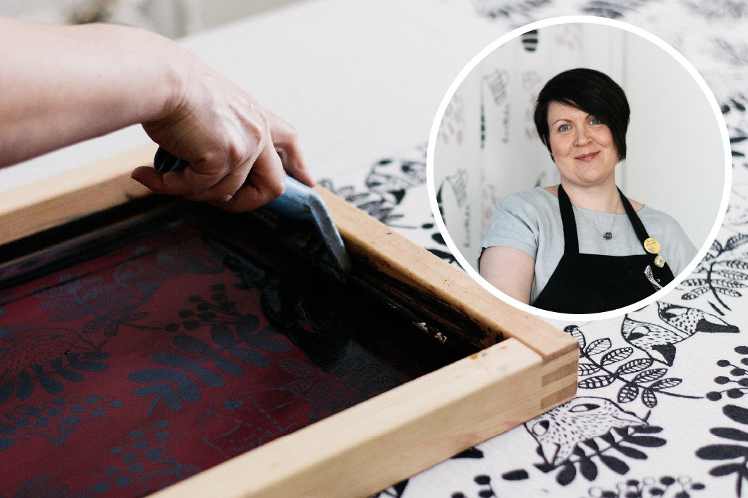 Kuva 1. Milja Olkkonen painaa kestotiskirättien kankaan käsityönä. (Kuva: Kierti)